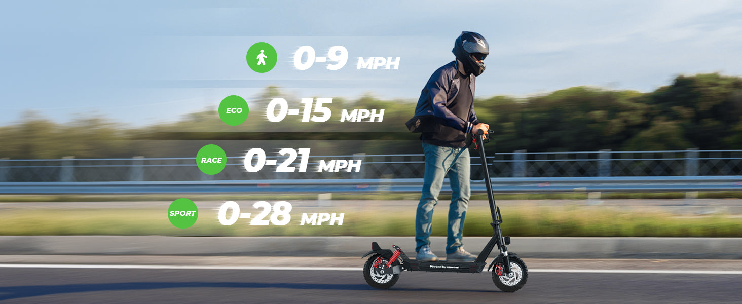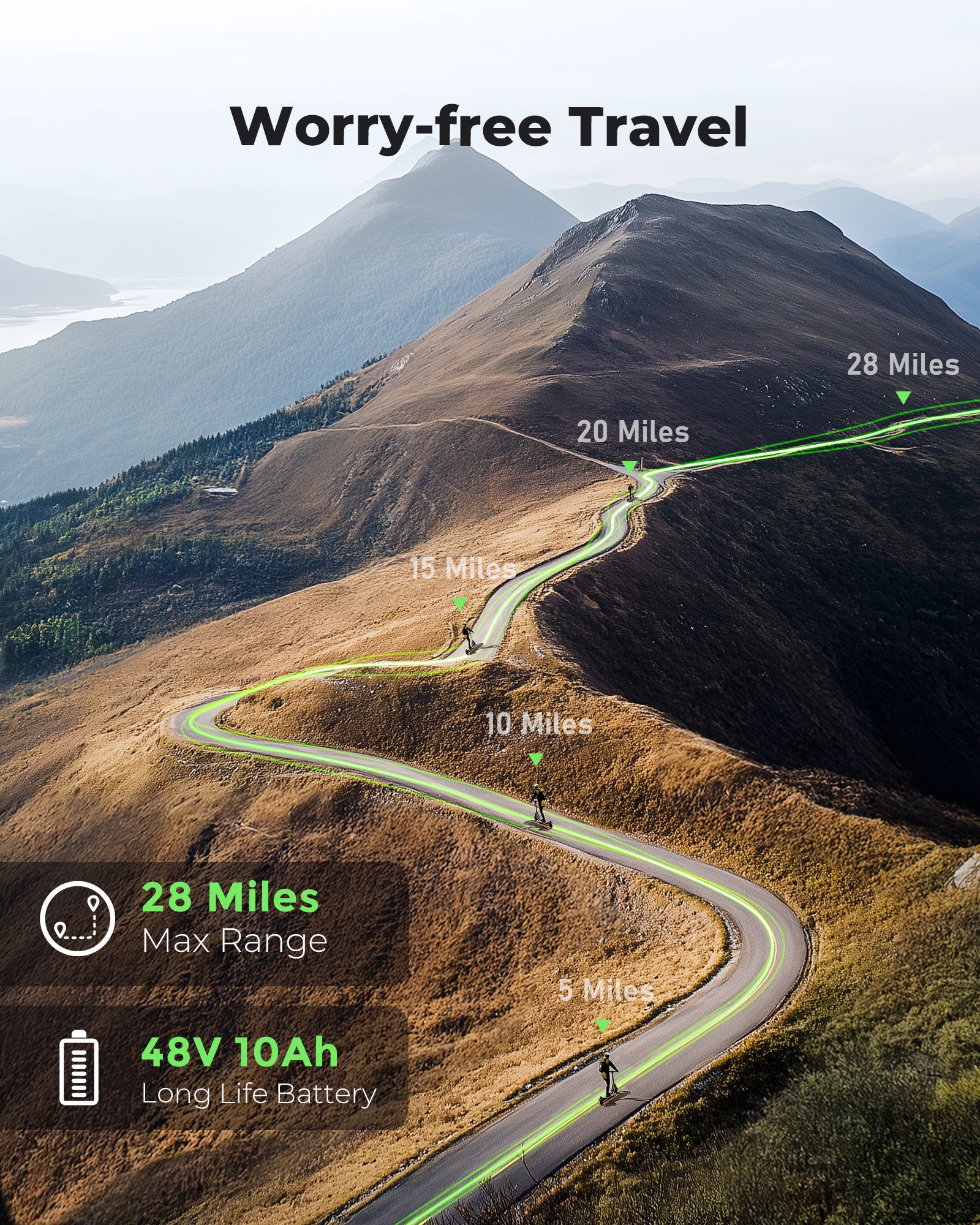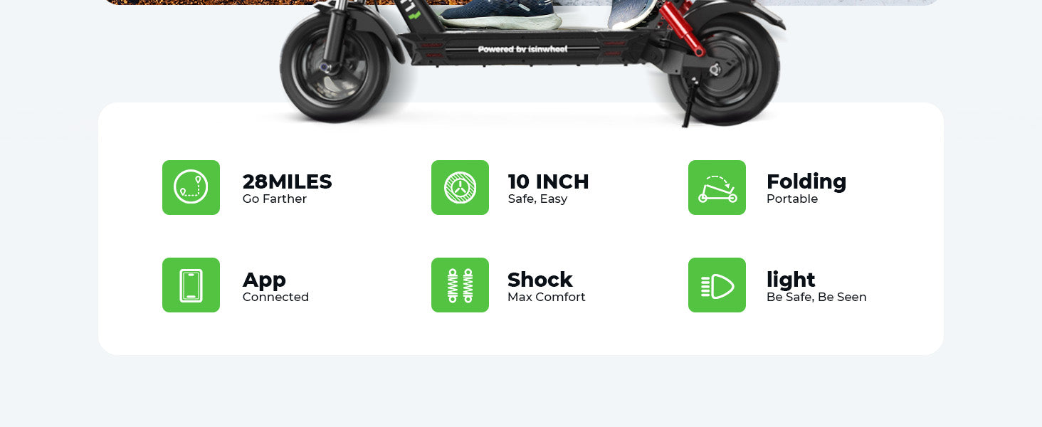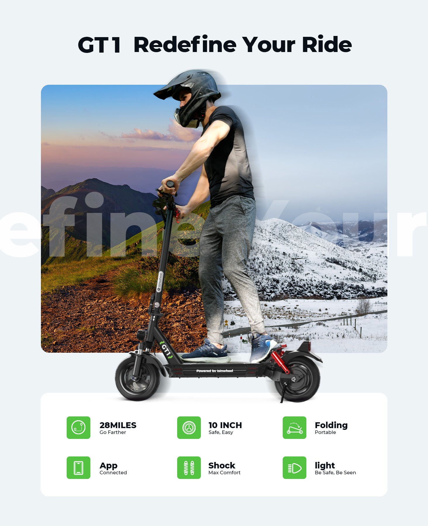 Experience excellent performance with speeds of up to 28MPH and an extended range of up to 28 miles. Equipped with a 800w rear wheel drive motor, The isinwheel GT1 (48V) 800w Off Road Electric Scooter offers excellent torque and good acceleration. The bright front and rear brake LED lights, side lights with turn signals, front and rear disc brakes with electric brake assist and dual front and rear spring shocks, all help to provide a safer ride for your adventures. Wider foot deck and 10" inch pneumatic off road tires help you to enjoy a more comfortable ride. The quick folding mechanism and lightweight design offers superior portability and convenience. The isinwheel app enables one touch start, smart anti-theft features and personalized riding modes for the best rider experience.