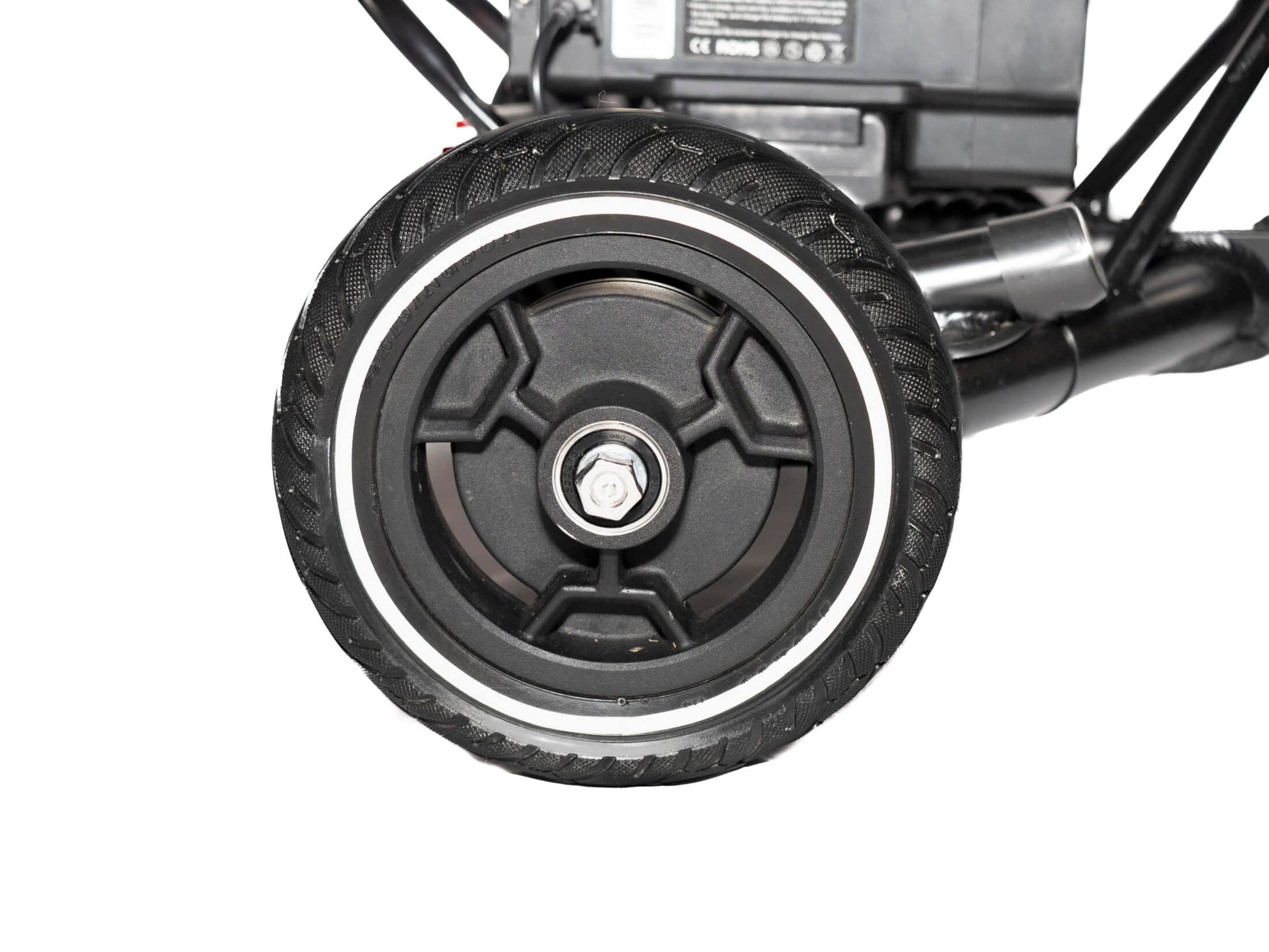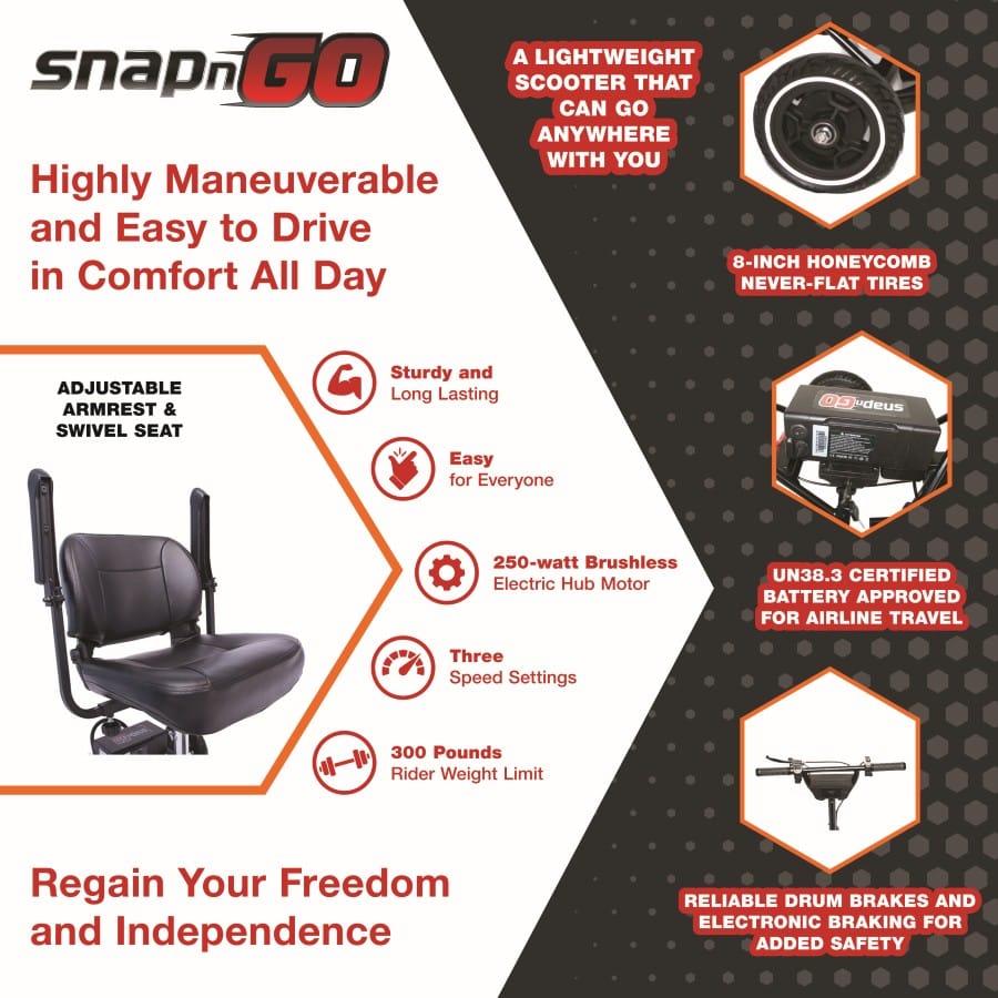 FeaturesTires - This New SNAPnGO Mobility Scooter Deluxe Edition features 8" honeycomb interior tires, which are guaranteed to never go flat. They offer excellent ride comfort and stability for both short and longer distance rides. Motor - This New SNAPnGO Mobility Scooter Deluxe Edition offers a 250w brushless electric hub motor. It has a top speed of 5 mph. It also has three selectable forward speed modes and reverse mode. Brakes - This New SNAPnGO Mobility Scooter Deluxe Edition offers a hand brake that activates dual rear drum brakes and electric motor brake. Battery - This New SNAPnGO Mobility Scooter Deluxe Edition is equipped with a 36V 6.4aH detachable LG Lithium Ion Battery. A full charge on this battery will last you 13 miles on a single charge and only takes 3 1/2 hours to fully charge. Seat - This New SNAPnGO Mobility Scooter Deluxe Edition has a padded swivel seat with a padded backrest, as well as adjustable armrests. This makes it extremely convenient and comfortable for a wide range of riders and uses. Size - This New SNAPnGO Mobility Scooter Deluxe Edition is small enough (16" x 24" x 40") when folded, that you can easily fold it up to put it in your trunk or any other place you decide to keep it until the next time you need it. The frame itself is only 31lbs, but even with all of the accessories installed (seat, battery etc.) this scooter only weighs 51lbs.